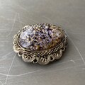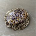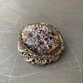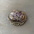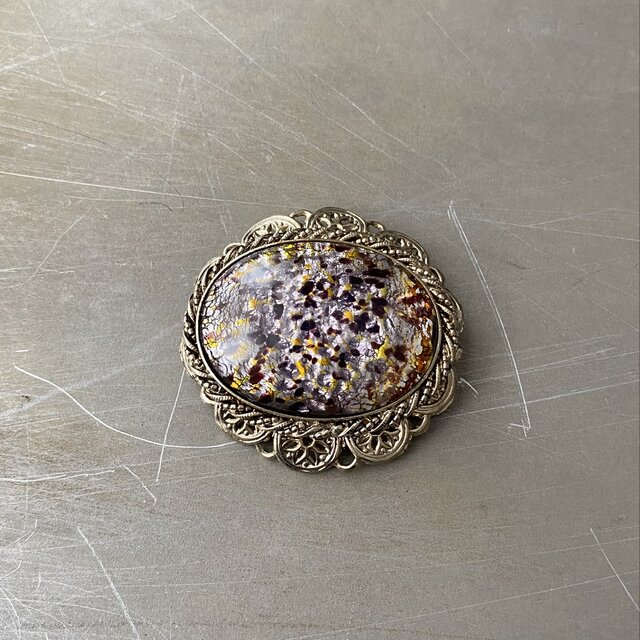 ガラスの内側から箔がキラキラと輝くクラシカルな雰囲気のヴィンテージブローチ。繊細で軽やかな透かしのメタル装飾が魅力的です。存在感がありストールやジャケット等のアクセントにおすすめです。