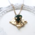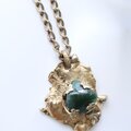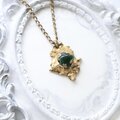 有機的なフォルムのゴールドトーンメタルに、深みのあるグリーンカラーのカボションをあしらった、アート性の高いデザインです。