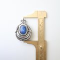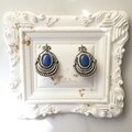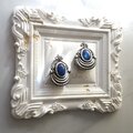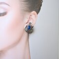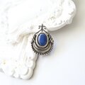 深みのあるロイヤルブルーのオーバルカボションを中央に配し、立体的なシルバートーンメタルで装飾されたクラシカルなデザインです。