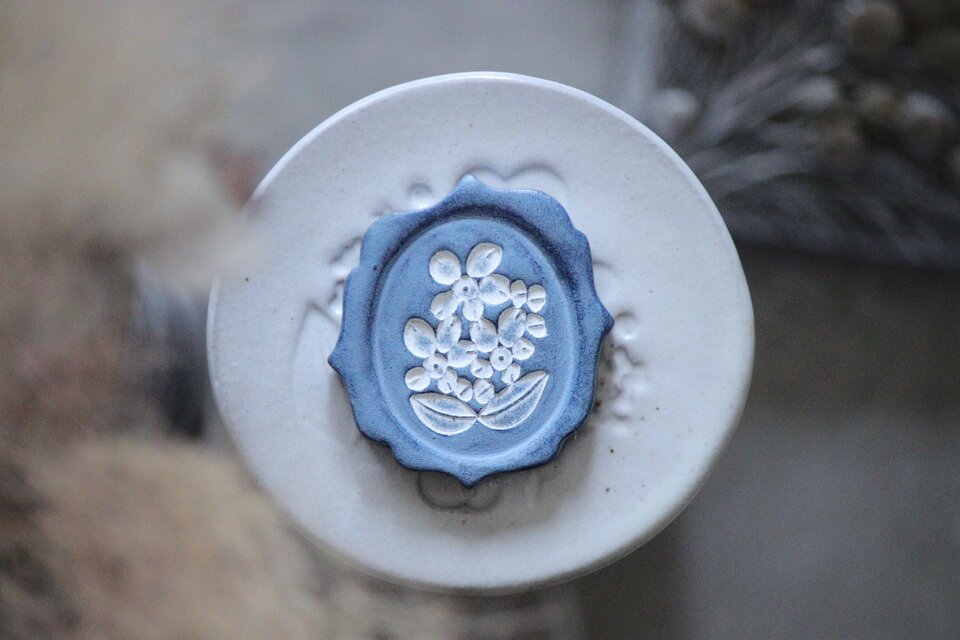 草花をモチーフに消しゴムはんこを彫り、はんこを陶土に捺しつけて凹凸の模様をつけたブローチです。