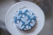 草花をモチーフに消しゴムはんこを彫り、はんこを陶土に捺しつけて凹凸の模様をつけたブローチです。