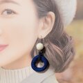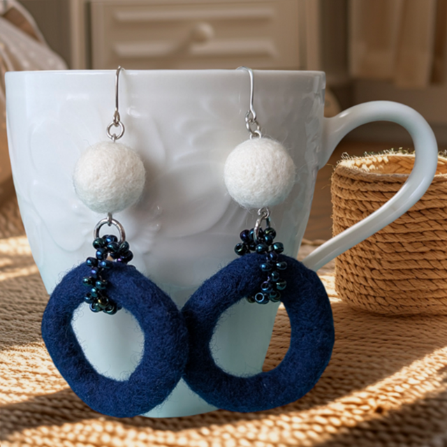 深みのあるネイビーのリングと、白のフェルトボールを組み合わせ、間には小さなビーズを添えて上品なアクセントにしました。