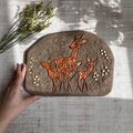 「鹿の親子」をモチーフにしたこの作品は、ザラッとマットな赤土の質感と、親子を彩る艶やかなオレンジ色の釉薬のコントラストが目を引きます。