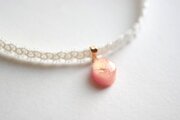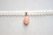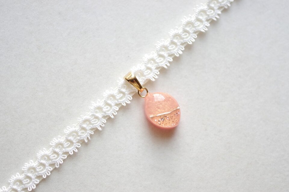 エレガントなローズピンクのマーキス型にゴールドの装飾を施したレジンを、サテンリボンにタティングレースで装飾を施したチョーカーに仕上げました。