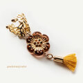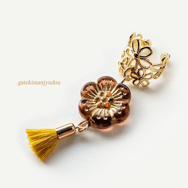 ダークオレンジの花型ビーズとマスタードカラーのミニタッセルのイヤーカフです