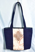 花七宝模様織り出し袋帯と紺色無地の名古屋帯をはぎ合わせて作りました。