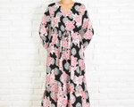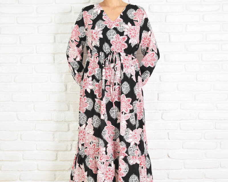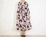 【大きいサイズ】オリエンタルフラワー柄Vネックの長袖ワンピース <ブラック> コットン 黒 花柄