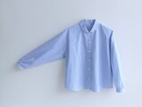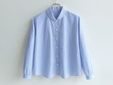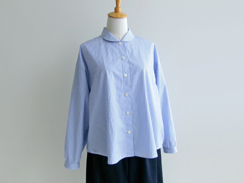 明るい青と白の約2mm幅のストライプの爽やかな雰囲気を生かして、小さなへちまカラーと、前たてに並んだ高瀬貝ボタンをアクセントに、シンプルですっきりとしたブラウスに仕立ててみました。スカートやキュロット、ワイドパンツにも合わせやすい、60cm丈です。