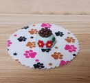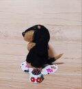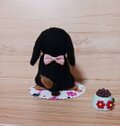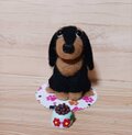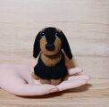 愛らしい羊毛フェルトのダックスフンドぬいぐるみと、ミニチュアの小物(肉球柄のコースターと小さな置物)のセットです。