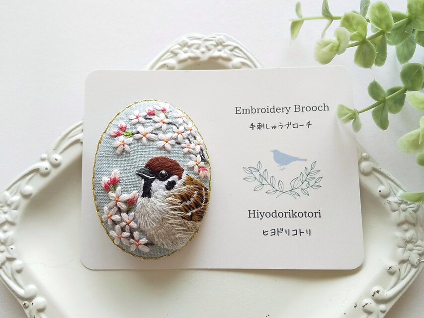 空色のリネンに、ふっくらしたスズメと桜を手刺繍したブローチ。