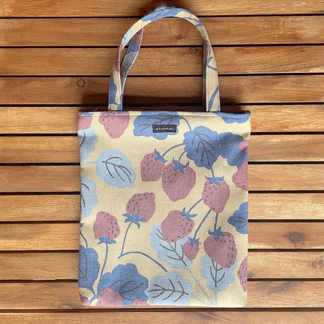 イチゴ柄で一期一会と名付けたテキスタイルから、小さくて素敵なミニトートバッグができました!嬉しいファスナー付きです!