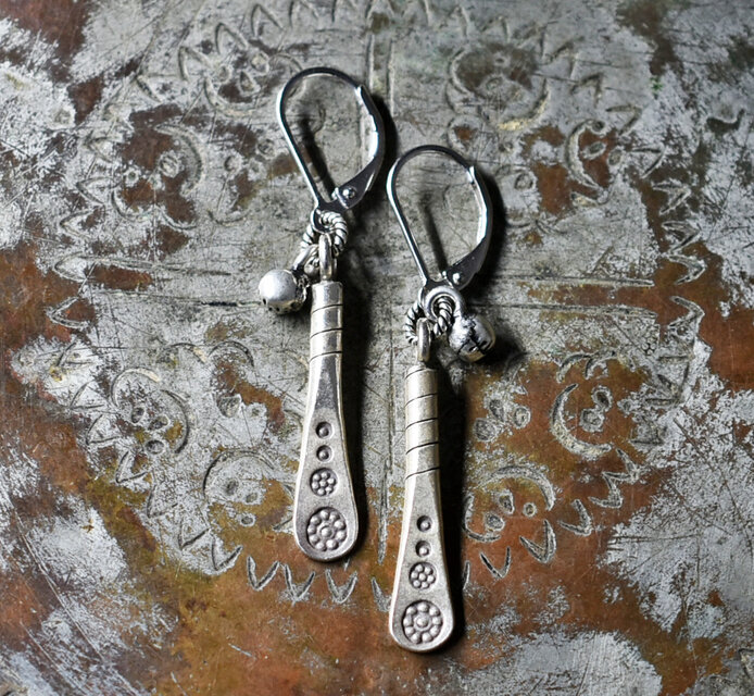 刻印入り笏型カレンシルバーとインドシルバー鈴のピアス