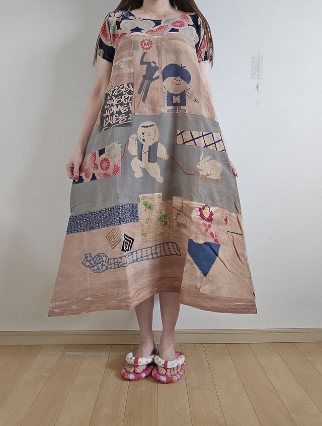 着物リメイク ハンドメイド 柿渋染め パッチワーク ワンピース