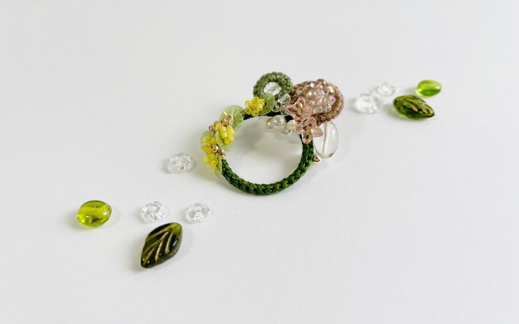 「一点ものとの出会いを楽しんでいただけたら」という想いで、ビーズをひと針ひと針バランスをみながら縫いつけて制作しております。
