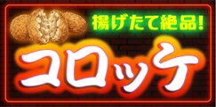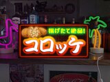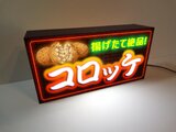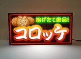 カラフルなネオン風のライトで目を引くコロッケのディスプレイ看板。