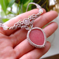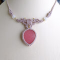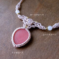 発色美しい濃いピンクカラーが印象的なアルゼンチン産インカローズ(ロードクロサイト)と小粒ながらも愛らしい薄桃色のローズクォーツをあわせ、サイドには良質なタンザニア産ムーンストーン丸玉をあしらった印象的なマクラメ編みチョーカーネックレスです。