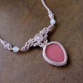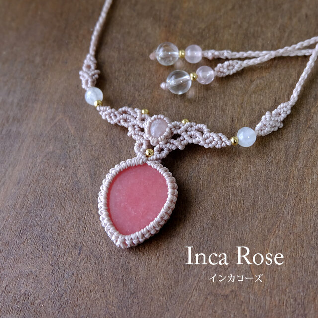 艶やかで愛溢れる華やかで気品漂う雰囲気のインカローズが引き立つように、明るめのコードで繊細に編みこんで存在感溢れる女性らしいマクラメアクセサリーに仕上げました。