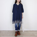 ネイビーダブルガーゼ・スカラップレース襟Vパフワンピース │お花見 ドライブ お出かけ コットン 旅行 刺繍 レース