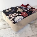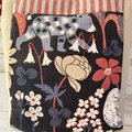 黒地に庭に咲く草花やクマを表現した物語のある柄です。