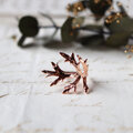 厚みのあるシャープな造形の葉をそのまま銅化し、植物標本のような静かな存在感と、金属ならではの強度を両立させました。