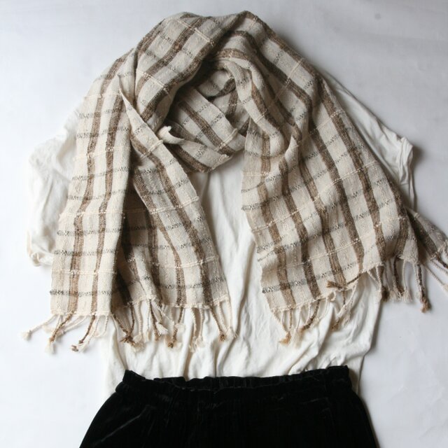 ショールとしては巾がコンパクト。肩から掛けるだけでなく、首周りに巻くのも良いです。