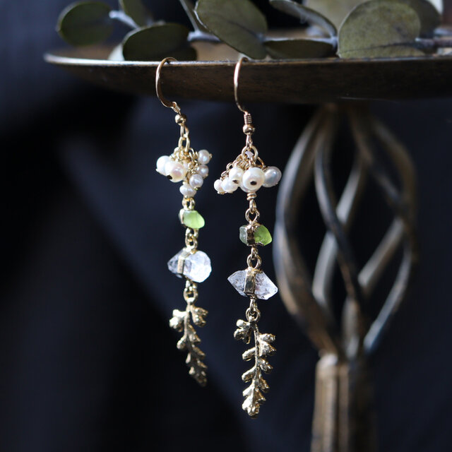 素材:パール・ペリドット・ダイヤモンドクォーツ(パキスタン産)・カニクサ(銅/K14ゴールドメッキ)・K14ゴールドフィルド(ピアス金具)