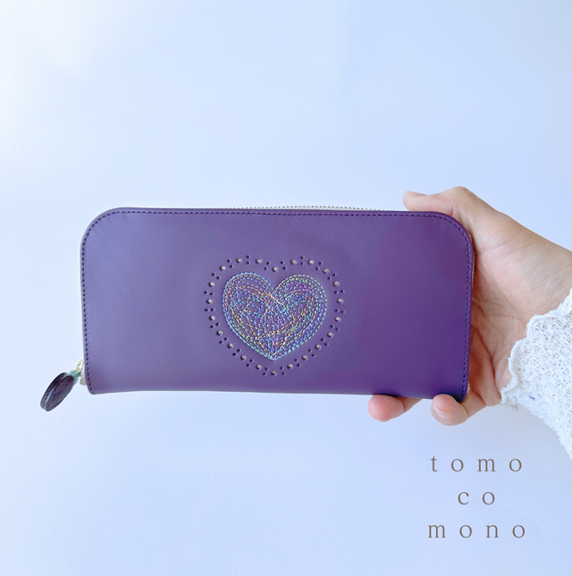 エコレザー × 刺繍革財布『HEART』PLUM/パープル(牛革)長財布☆ラウンドファスナー☆のコピー