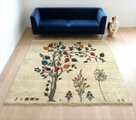 このラグの主役は、ダイナミックに枝を伸ばす「ザクロの木」です。イランではザクロは「子宝」や「豊かな生命力」の象徴。赤、青、黄色と、宝石のように散りばめられた実のひとつひとつが、ご家族のこれからの幸せと成功を祝っているかのようです。