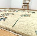 ベースカラーは、染めていない羊毛本来の美しさを活かしたアイボリー。お部屋に敷くだけでパッと空間が明るくなり、どんなインテリアにも馴染みながら、主役級の存在感を放ちます。天然ウールならではの優しいグラデーション(アブラッシュ)が、見る人の心を落ち着かせてくれます。