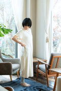 裾左側のみ膝くらいまでのスリットが入っていて、動きやすく涼しくデザインしました。