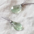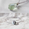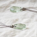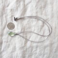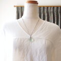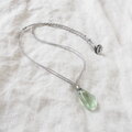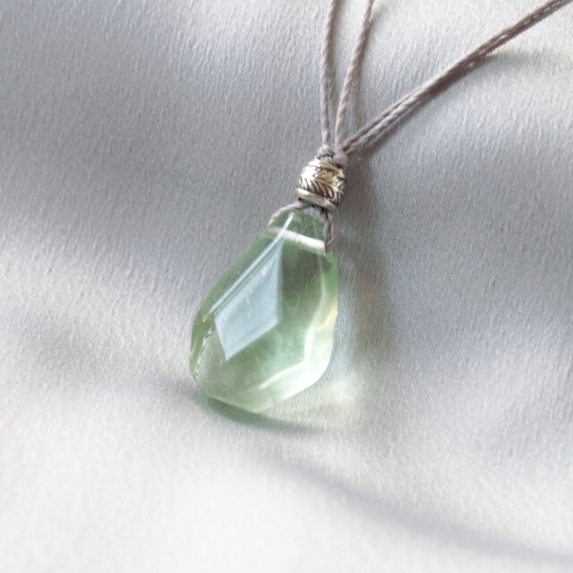 透明感があってみずみずしいライトグリーンのフローライトにリーフ模様が入ったカレンシルバーを添えて、グレー色のポリエステルコードで繋いだシンプルで爽やかな雰囲気のペンダントです。