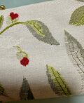 実際にオフホワイトの地に織られたオリーブの葉 木 吾亦紅のような赤紫