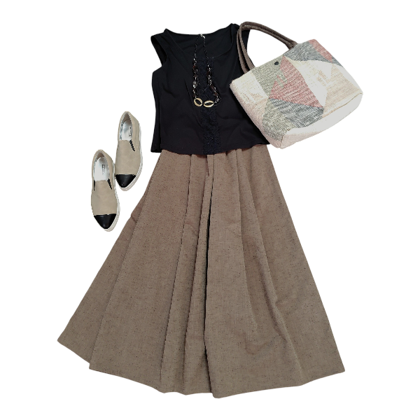 トップスは、黒や白のTシャツもいいし、リネンのシャツ、春秋はカーディガンもいいでしょう。