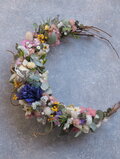 瀬戸内の森で育った春らしい色の草花を、まるでリースそのものが生命を持って芽吹いたかのように動きを出して紡ぎました。