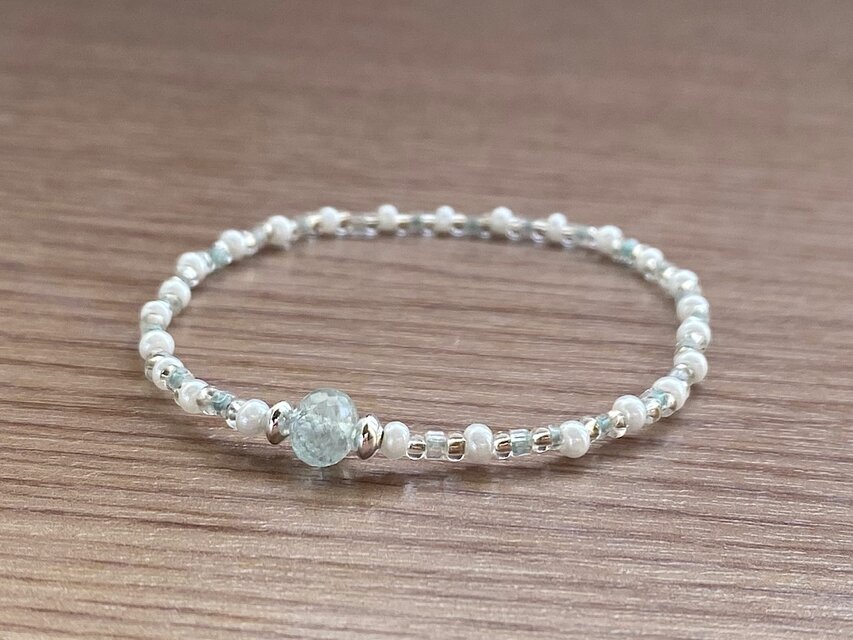 モスアクアマリンとホワイトとグリーンのヴィンテージビーズを使用したブレスレット。