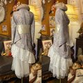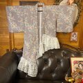 【単衣 着物 2way アシンメトリー ガウン 羽織り ドレス ワンピース ハンドメイド 和洋折衷 洗える 化繊 リメイク 帯サッシュベルト レトロ 古着 灰桜の波紋 × 咲き誇る梅 KD-100】