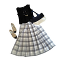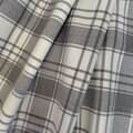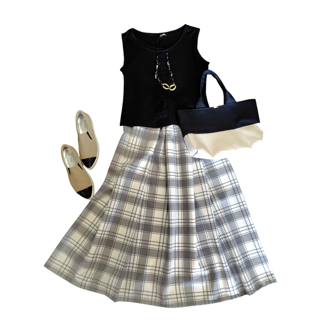 今回の格子、あえて格子といいますが、大人っぽいチェックのスカートは、地色が白なので洗練された感じ、それでいてグレーのチェックが柔らかい雰囲気を持っていると思います。