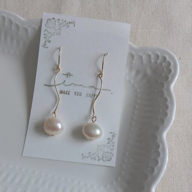 14kgf 大粒淡水パールのウエーブピアス
