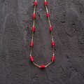 耐久性に優れ、品よく輝く14KGFチェーンに、艶やかなディスク型レッドコーラルをリズミカルに配したステーションネックレス。