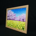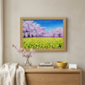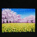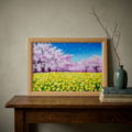 本作品の特に注目すべき点は、菜の花の黄色と桜の淡いピンクとの鮮やかな対比です。これにより、まさに日本の春の極致とも言える景色が展開されています。青空を背景に、風に舞う花びらが描かれた様子は、静止しているように見える絵画の中に心地よい「春の風」の動きが生まれているのです。空へと溶け込んでいく桜の描写は、儚さと美しさが共存し、タイトルの通り「生命の輝き」を象徴しています。