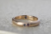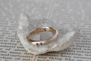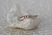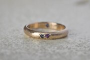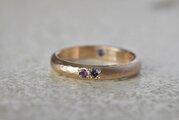 10金に槌目を打って制作を行った甲丸リングに美しいアイオライトとアメジストを留めて、リングの内側にもアイオライトを一粒留めて制作を行った作品になります。