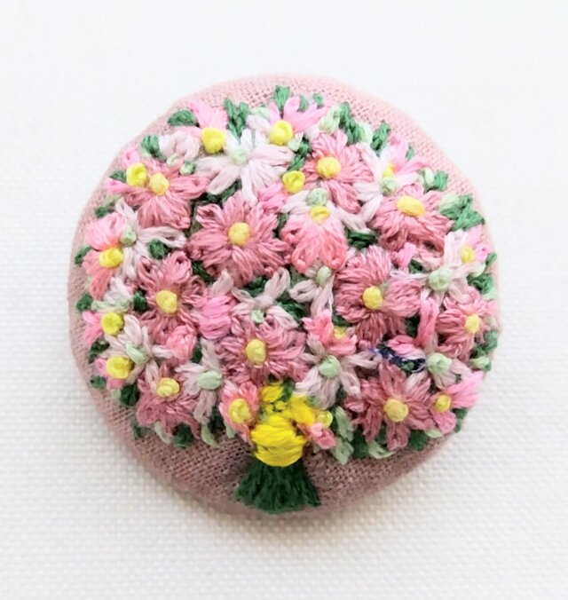 スモークピンク色綿リネン生地に優しい色合いのピンクの花束をモチーフにした刺繍ブローチです。