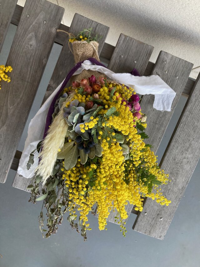 ドライユーカリとポンポンミモザを束ねました。