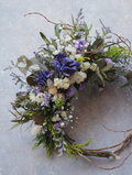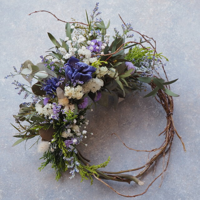 ユーカリ(7種)、スターチス(3種)、アネモネ、HBスターチス、ラグラス、カスミソウ、センニチコウ、ブルーファンタジア、ミモザ、アオツヅラフジのツル