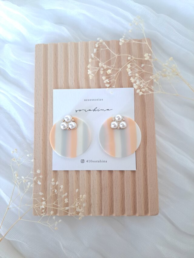 淡いストライプにパール風を組み合わせ、優しいパステルの色味でまとめたアクセサリー。