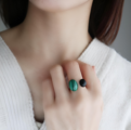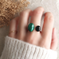 天然石マラカイト×オニキスのフォークリング|孔雀石のグリーンと漆黒の大人リング 金アレ対応