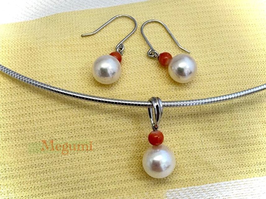 日本の海が育んだアコヤ真珠に小さな赤サンゴ。海の「恵」を二つ合わせてペンダントとピアスのセットにしました。とってもシンプルなデザインは日本のイメージそのものだし、紅白でおめでたいのであります。