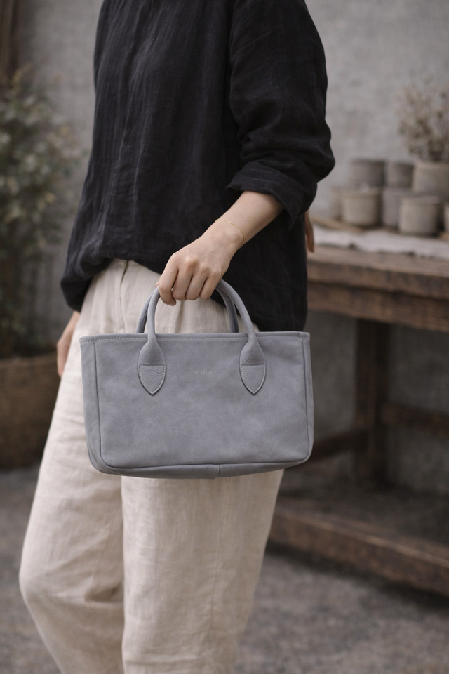 牛革ヌバックで仕立てた、スモールサイズのアトリエバッグ。
