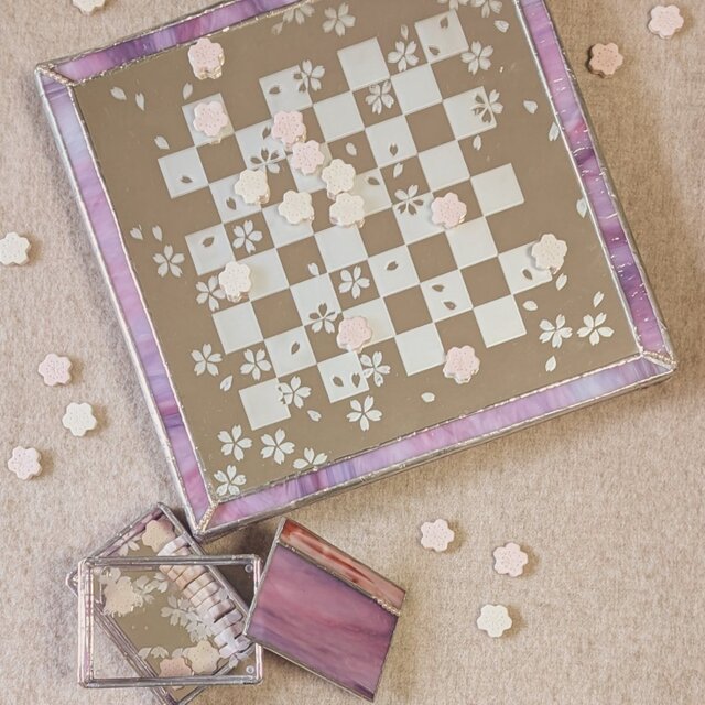 ステンドグラスの盤と桜型の陶器のコマ(白とピンク)のリバーシです(コマのピンクは薄めに写っています)。