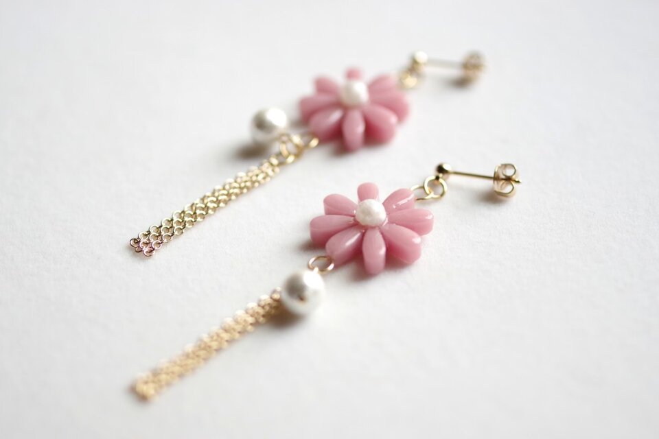 中心の花芯とコットンパールの光沢のある輝きが上品なピアス。
